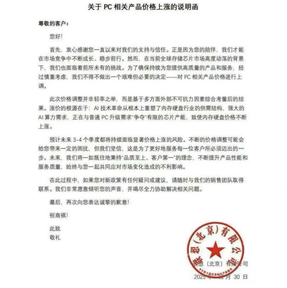 上游的成本压力传导到终端电脑价格。2025年12月30日,联想向客户发布说明函称,“经过慎重考虑,我们不得不做出一个艰难但必要的决定——对PC相关产品价格进行上调。”华硕、戴尔等多家PC厂商也已启动调价机制。